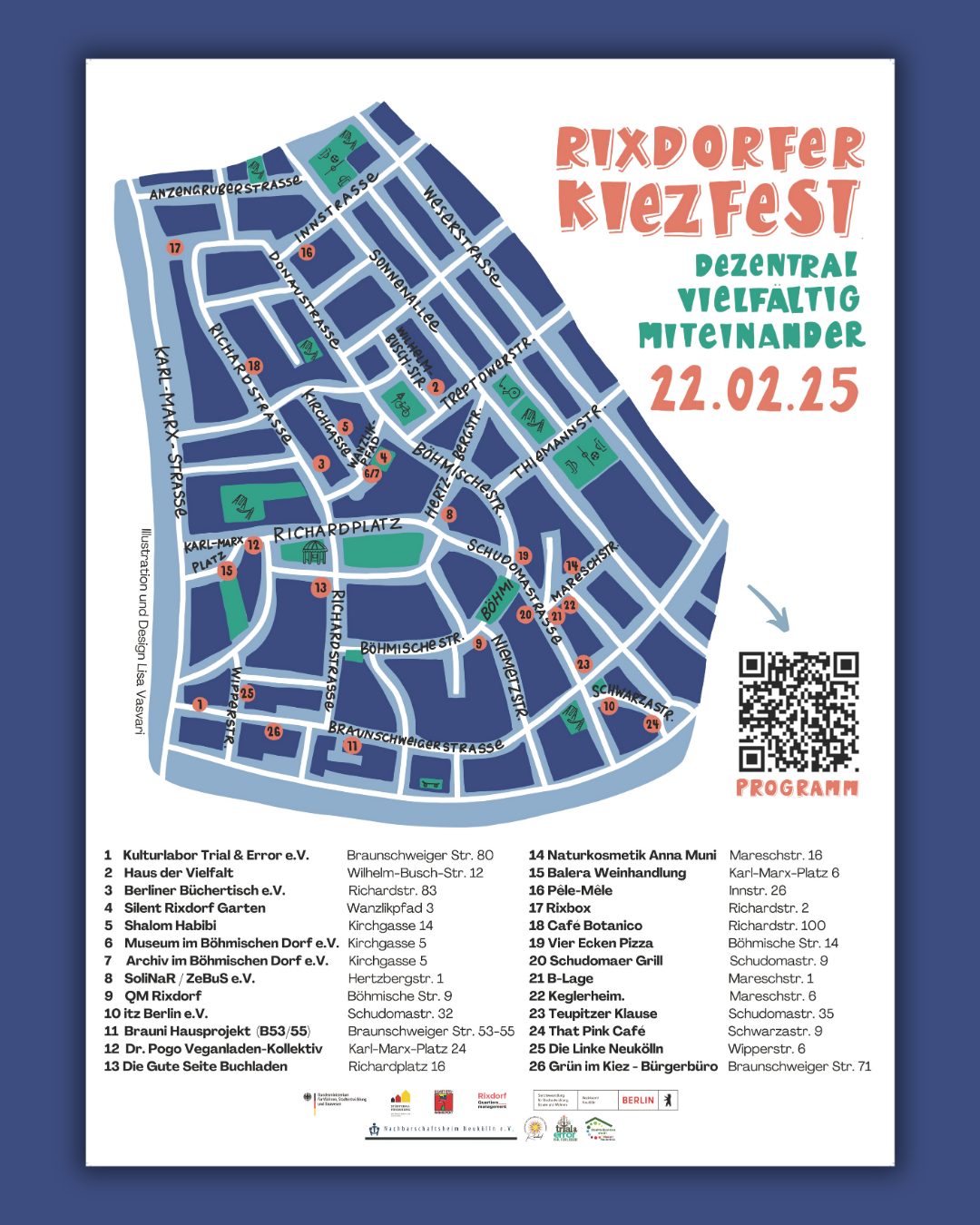 Es gibt in Rixdorf viele Treffpunkte und Kiez-Wohnzimmer, aber nicht jede*r kennt diese Orte. Das Kiezfest wird dies ändern! Zahlreiche Initiativen, Geschäfte und Cafés können mithilfe einer Kiezkarte entdeckt werden. Die Karte wird an allen teilnehmenden Orten ausliegen, unter anderem beim Kulturlabor Trial & Error e.V. (Braunschweiger Str. 80, 12055 Berlin), das am 22.02.25 von 12:00 bis 18:00 Uhr geöffnet ist. Alle bieten an diesem Tag ein Programm oder ein Kiezfest-Angebot an. Von kreativen Workshops über Musik und Tanz bis hin zu einem Kiezfest-Rabatt auf Essen oder Getränke ist alles dabei.
