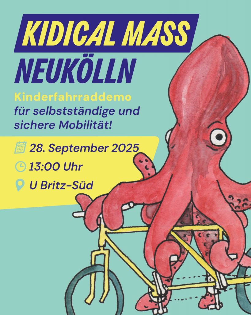 Am 28. September 2025 erobern die Kinder wieder die Straßen Neuköllns – bei der Kidical Mass! Wir laden alle kleinen und großen Radler:innen herzlich ein, gemeinsam ein buntes Zeichen auf zwei Rädern zu setzen.