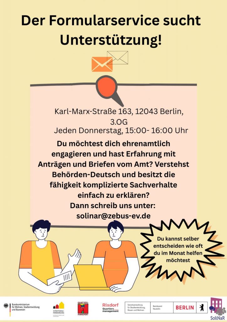 Du möchtest dich ehrenamtlich engagieren und hast Erfahrung mit Anträgen und Briefen vom Amt? Verstehst Behörden-Deutsch und besitzt die fähigkeit komplizierte Sachverhalte einfach zu erklären? Dann melde dich bei SoliNaR (Solidarische Nachbarschaft Rixdorf)! SoliNaR bietet jeden Donnerstag von 15-16 Uhr einen kostenlosen Formularservice an – ein wichtiges Angebot für Nachbar*innen, die überfordert mit Briefen vom Amt sind. Das Angebot ist zwar jeden Donnerstag, das heißt aber nicht, dass du wöchentlich kommen musst. Es gibt eine Gruppe von ehrenamtlichen Helfer*innen, die sich untereinander absprechen, wer wann kommt.