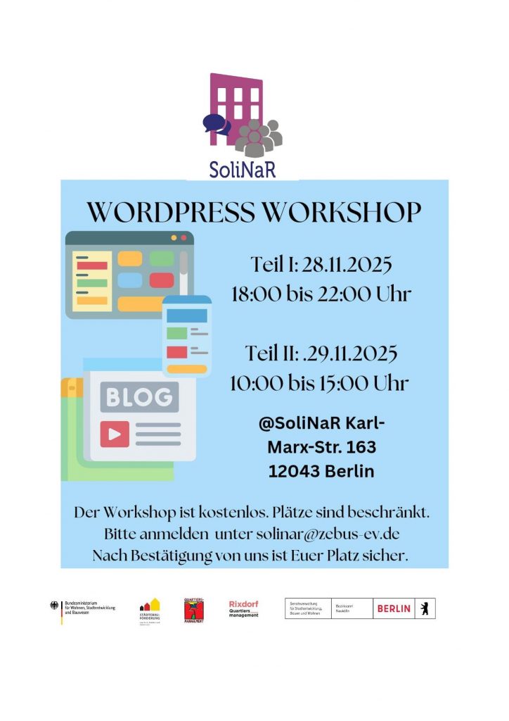 SoliNaR bietet einen kostenlosen WordPress Workshop an. Die Plätze sind beschränkt. Meldet euch also schnell an! Anmeldung via E-Mail bis 27.11.25 an solinar@zebus-ev.de Nach Bestätigung ist Euer Platz sicher.