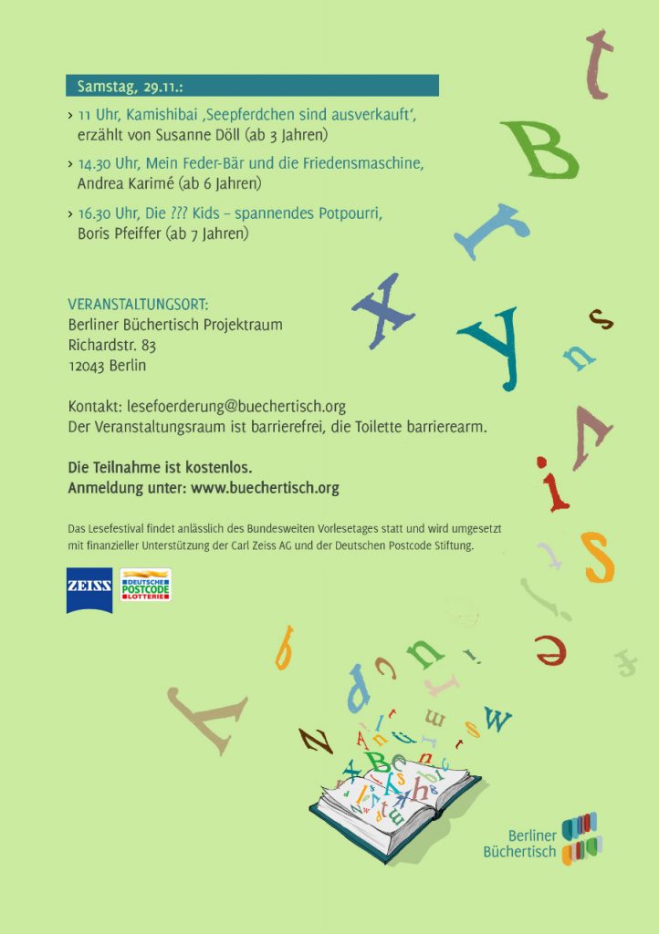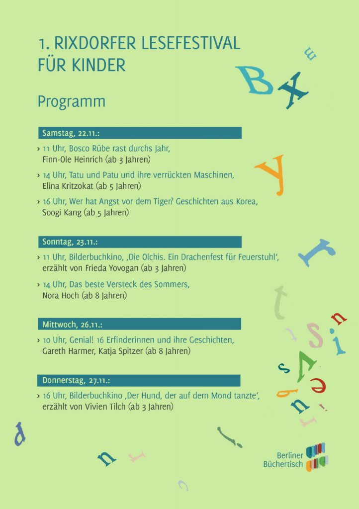 Der Berliner Büchertisch stellt das erste Rixdorfer Lesefestival für Kinder auf die Beine – inklusive 15 verschiedenen Autor*innen-Lesungen, Bilderbuchkino, Erzählungen und Kamishibai! Lasst euch das nicht entgehen!