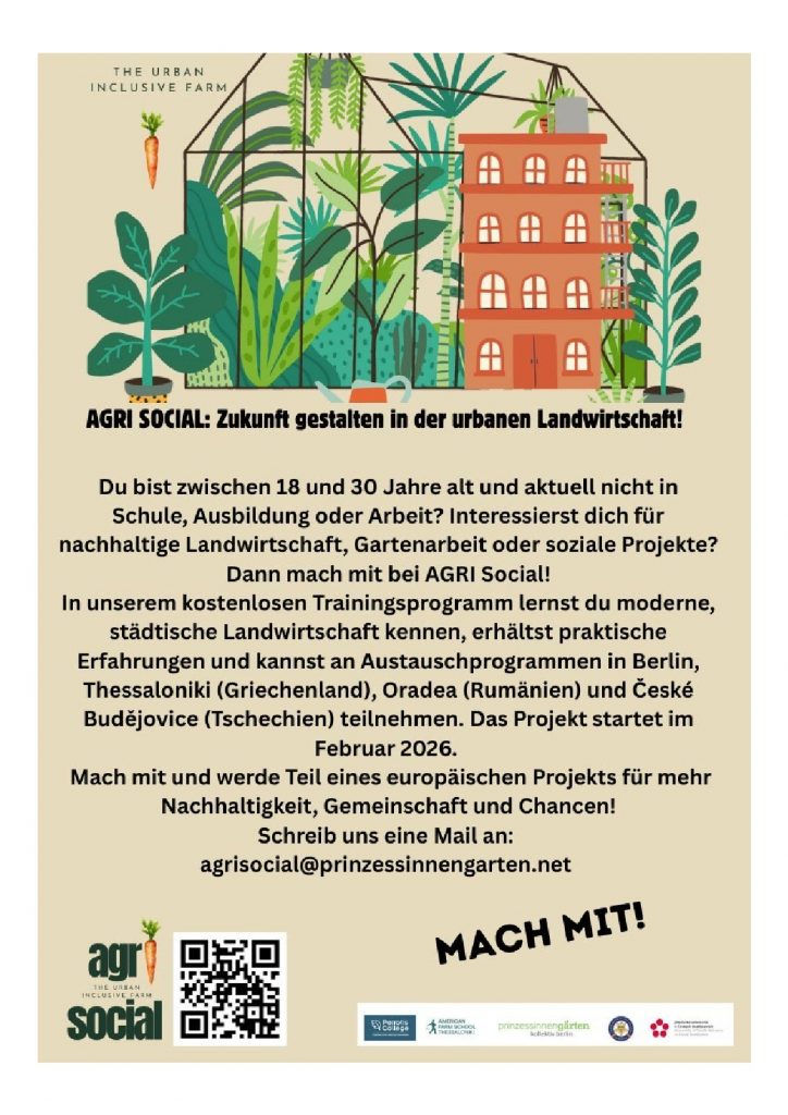 Die Prinzessinnengärten bieten ein kostenloses Trainingsprogramm an, in dem du moderne, städtische Landwirtschaft kennenlernst, praktische Erfahrungen erhältst und kannst Austauschprogrammen in Berlin, Thessaloniki (Griechenland), Oradea (Rumänien) und České Budějovice (Tschechien) teilnehmen kannst. Das Projekt startet im Februar 2026.