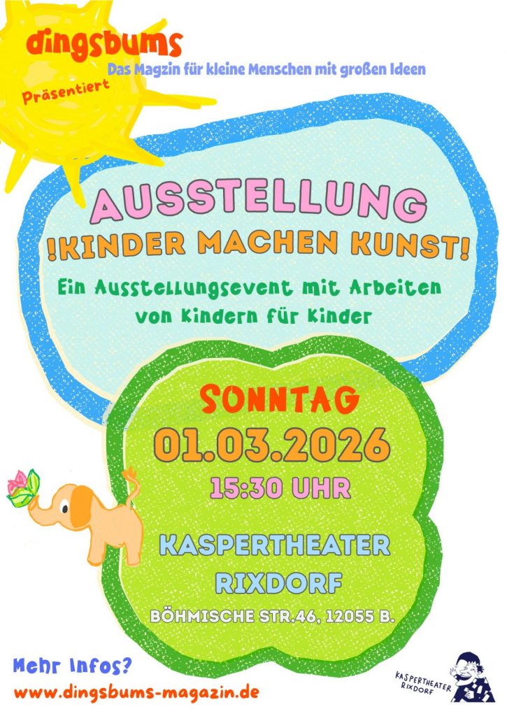 Diesen Sonntag, den 1. März, um 15:30, findet im Kasper Theater Rixdorf eine Ausstellung von Kindern für Kinder statt. Gezeigt werden Werke, die Im Rahmen zweier Workshops entstanden sind. Dabei haben sich Kinder im Alter von 2-5 Jahren in Begleitung auf eine Entdeckungsreise begeben und mit unterschiedlichsten Materielien eigene Ideen umgesetzt. Der Sonntag ist die Abschlussveranstaltung dieser tollen Workshopreihe!